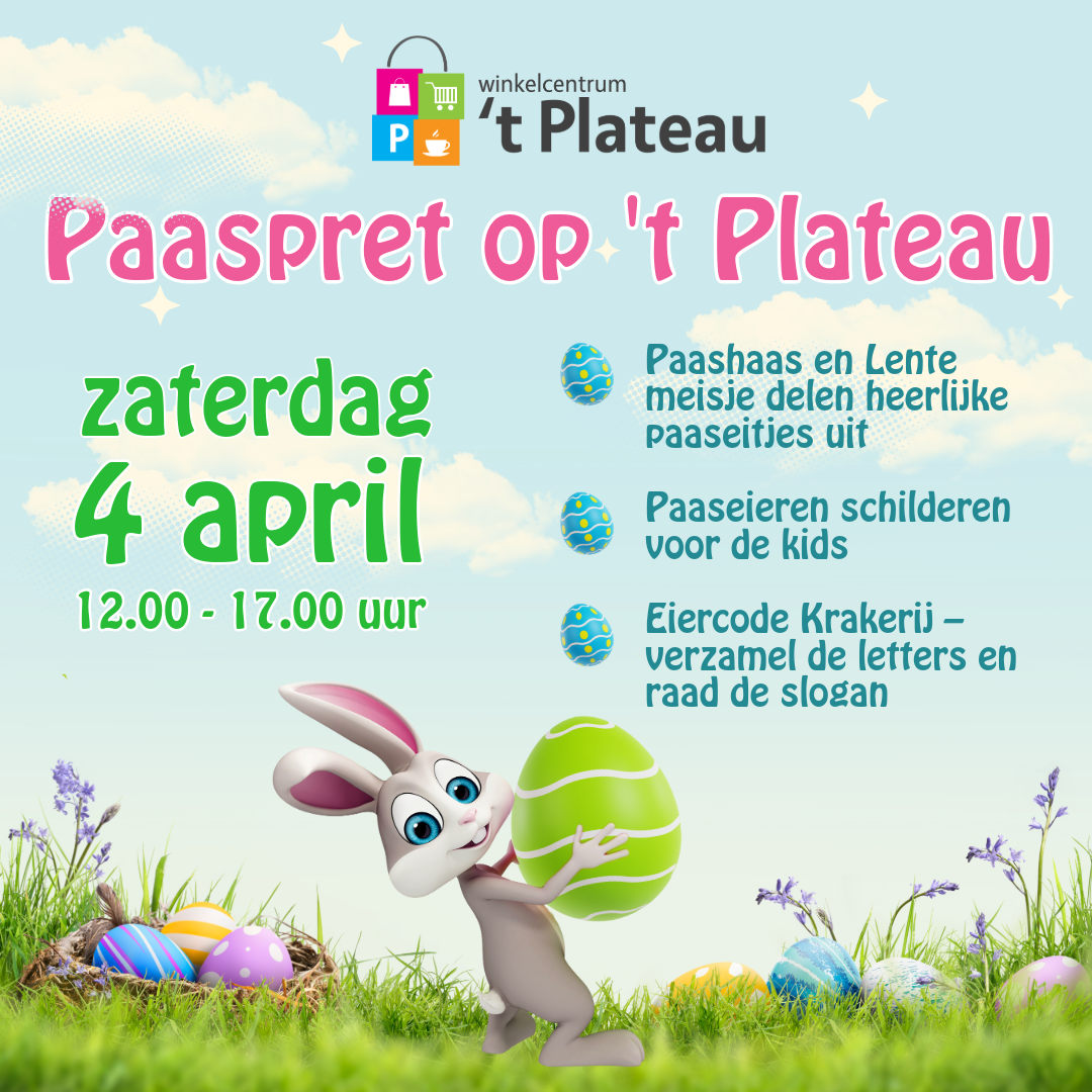 Zaterdag 4 april wordt het extra gezellig op Winkelcentrum 't Plateau. Van 12.00 tot 17.00 uur maken we er een vrolijke paasmiddag van!Ontmoet de Paashaas en het Lente meisje, ze delen heerlijke paaseitjes uit en zorgen voor vrolijkheid.Paaseieren schilderen - voor alle kids ligt er iets vrolijks klaar. Pak een kwast, kies je kleuren en... |